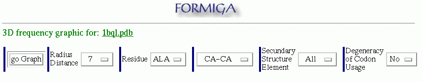 In this example, "Glycine: 3.0" indicates that there are 3 contacts in 3D between glicine and the base residue (serine, in this example) in the 1bql.pdb file. "14.2%" indicates that those 3 contacts represent 14,2% of total contacts in 3D and , "||Alpha: 0.0 |Beta: 0.0 | Turn: 0.0 | Coil: 3.0 ||" indicates that 3 glycines that make the contact with the base residue, 0 are in the alpha helix conformation, 0 are in the beta conformation, 0 are in the turn conformation and 3 are within coil conformation. Similar information is available for any of the 20 amino acids. The user should "walk"the mouse above the graphical bars and information will appear on the status area. In case that the user did NOT choose the Secondary Structure Element, that is, indicating ALL secondary structure elements, FORMIGA will present non differentiated (cumulative) number, representing the frequency for all elements of SS. The user still has the option to click on the Frequency for residue classes and the graph will assume the form which sums hydrophobic, charged, polar residues and the glicine in cumulative graphic bars.